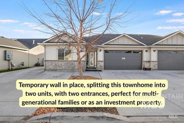 Welcome to this thoughtfully designed 3-bedroom, 3-bath townhouse in North Twin Falls offering 1,573 sq ft of comfortable living space. Inside, youll find durable LVP flooring and beautiful granite countertops throughout, along with an open-concept kitchen and living area filled with natural light that makes the home feel bright and inviting. A temporary wall has been added to create two separate living areas, each with its own entrance, offering incredible flexibility for multi-generational living, guests, or a private home office setup. One of the bedrooms also features its own breakfast bar area with a sink, mini-fridge, and microwave, adding even more versatility to the space. The primary suite includes dual vanities and a relaxing retreat-like feel. Step outside to a large fully fenced backyard providing plenty of room for outdoor living, pets, or entertaining. Conveniently located near shopping, dining, and the canyon, this home offers comfort, flexibility, and a great North Twin Falls location.